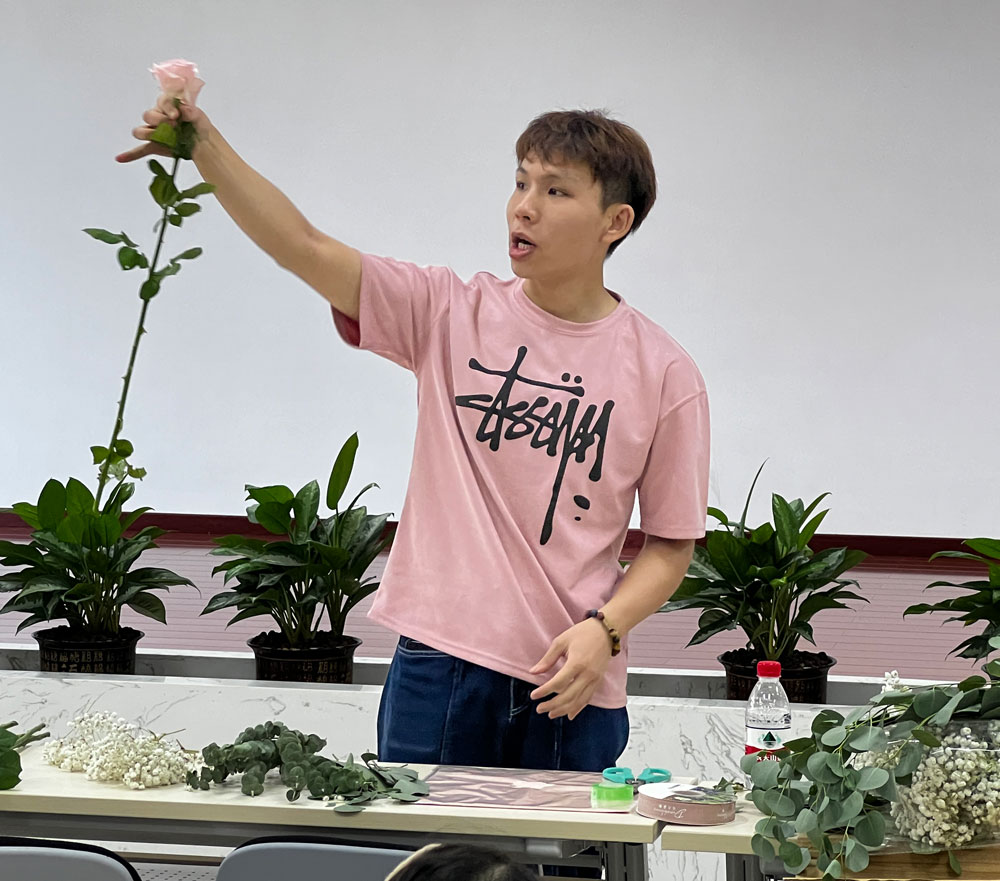 在老師的悉心指導下,大家大膽發揮自己的想象力,通過自己靈巧的雙手,將經過修剪的多種花材,根據不同的色彩、形狀,有層次地搭配在一起。