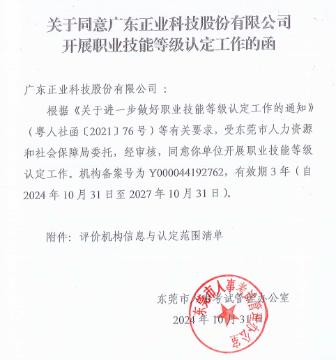 近日,廣東正業科技股份有限公司(以下簡稱:正業科技)收到了東莞市人事考試管理辦公室“關于同意廣東正業科技股份有限公司開展職業技能等級認定工作的函”。這標志著公司順利完成了職業技能等級認定備案工作,開啟了公司技能人才隊伍培養與認定的新篇章。